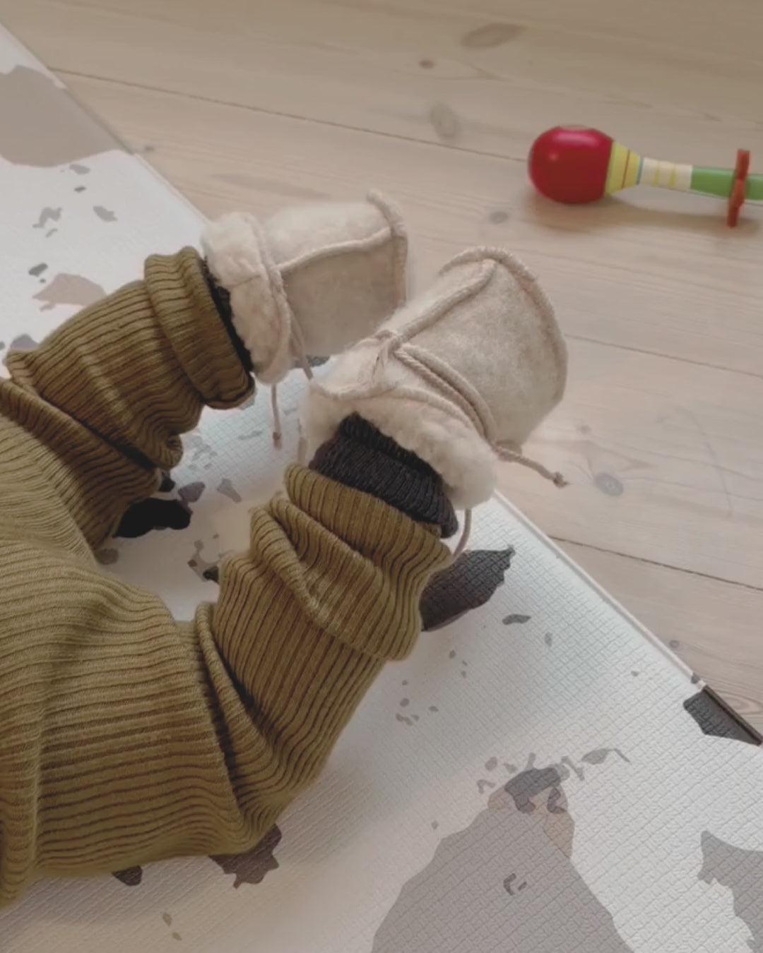 Disse babytøfler i 100% myk og varm merinoull er designet for å holde de små føttene varme og komfortable hele dagen. Merinullens naturlige isolerende og pustende egenskaper sikrer at føttene verken blir for varme eller kalde, og de er perfekte i de første månedene når komfort og varme er ekstra viktig.